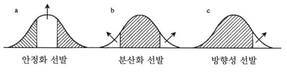 그중 어떤 개체를 어떤 목적으로 선발하냐에 따라 선발은 크게 안정화 선발, 분산화 선발 그리고 방향성 선발로 나눌 수 있습니다.
