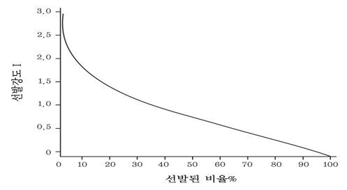 선발강도 I값은 위 표로 계산할 수 있으며, 선발 비율에 따른 선발 강도는 지수함수적 특성을 갖습니다.