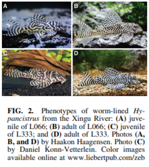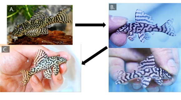 야생에서 주로 발견되는 L340 플레코의 경우에는 A.와 같은 모습을 하고 있으나, 수백 수천마리의 야생개체 중 혹은 야생개체를 번식하다 드물게 B.와 같이 흰색 무늬가 더욱 도드라진 개체를 얻었습니다.