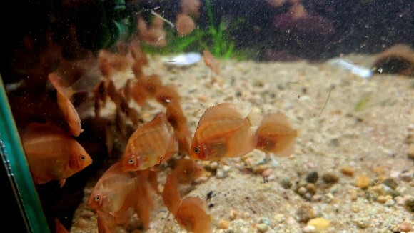 그래도 아직까지는 치어들이 먹이를 먹거나 할 때 부모 개체들이 그 주위에서 머무는 일이 많습니다.