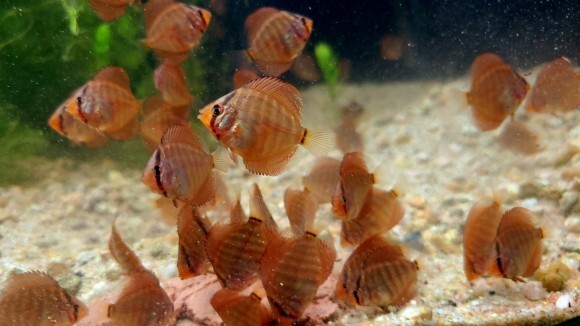 부화 30일째부터 치어들은 수족관에서 볼 수 있는 가장 작은 크기의 디스커스들과 비슷한 모습을 갖게 되었습니다.