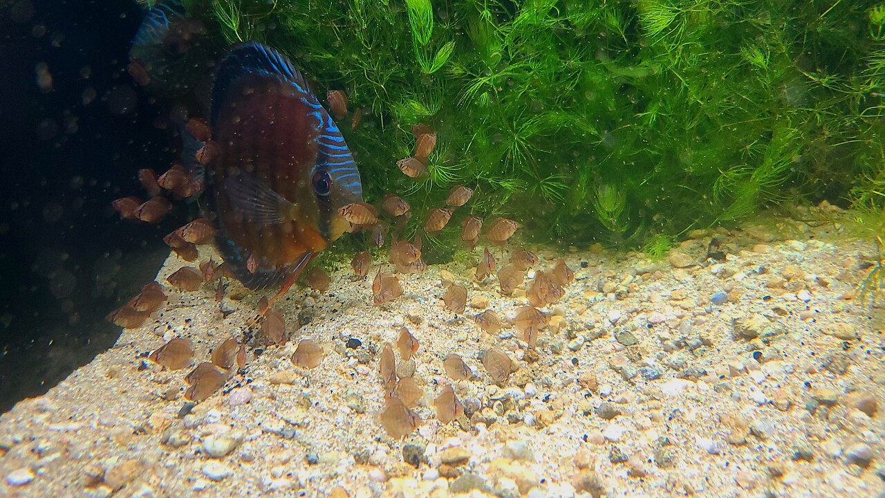 일반적으로는 디스커스의 마릿수를 늘리는데에 너무 치중하다보니 보기 어려운 장면이 되었는데, 개인적으로 디스커스 번식에 있어 이 부분이 가장 재미있고 볼 가치가 있는 장면이라고 생각합니다.