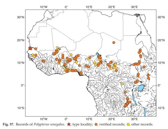 폴립테루스 세네갈스는 아프리카에서 가장 널리 서식하는 폴립테루스 종으로, 늪지에서부터 물 흐름이 있는 강까지, 널리 서식합니다.