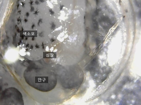 안구, 척추, 심장, 혈관 그리고 색소포 등이 형성되있는 모습을 확인할 수 있습니다.