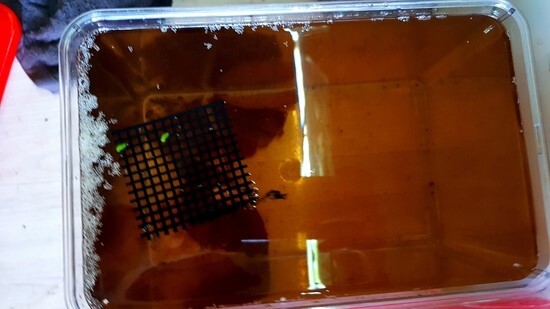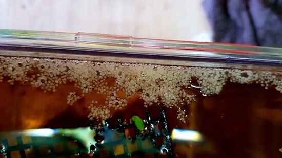 더불어 수컷 개체가 거품집을 지을 때 공기중 습도가 낮으면 매우 불리하기 때문에 채집통 뚜껑과 통 사이에 숨구멍을 뚫은 비닐을 끼워 수면부분의 습도가 높게 유지될 수 있도록 하였습니다.