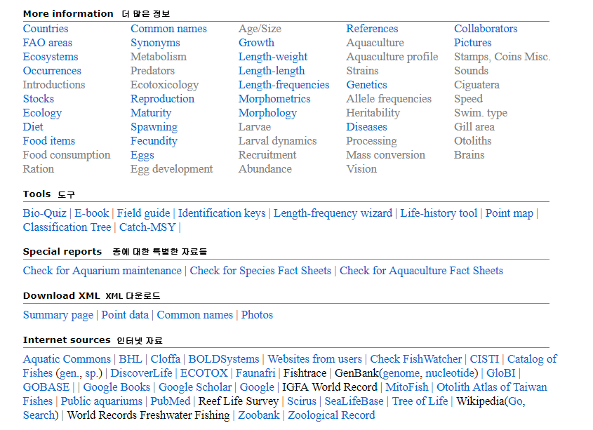 해당 종에 대한 더 많은 자료들을 찾을 수 있는 칸으로 아래에서 추가 설명을 하겠지만, 이 칸을 어떻게 이용하는가에 따라 Fishbase의 활용도가 달라집니다.