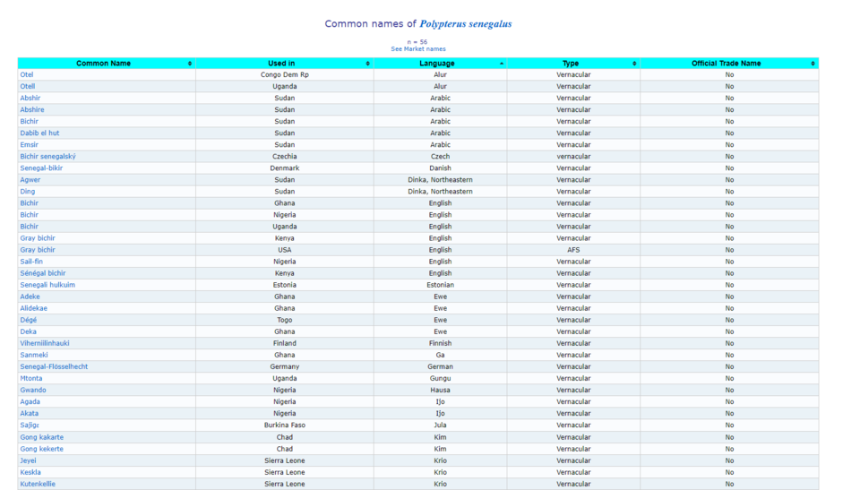 이 칸에서는 해당 어종의 학명이 아닌 평상시에 불리는 커먼네임(유통명)이 전 세계 언어로 적혀있으며, 앞부터 커먼네임, 사용 국가, 사용 언어, 타입(방언 여부) 마지막으로 공식 유통명인지 여부가 적혀있습니다.