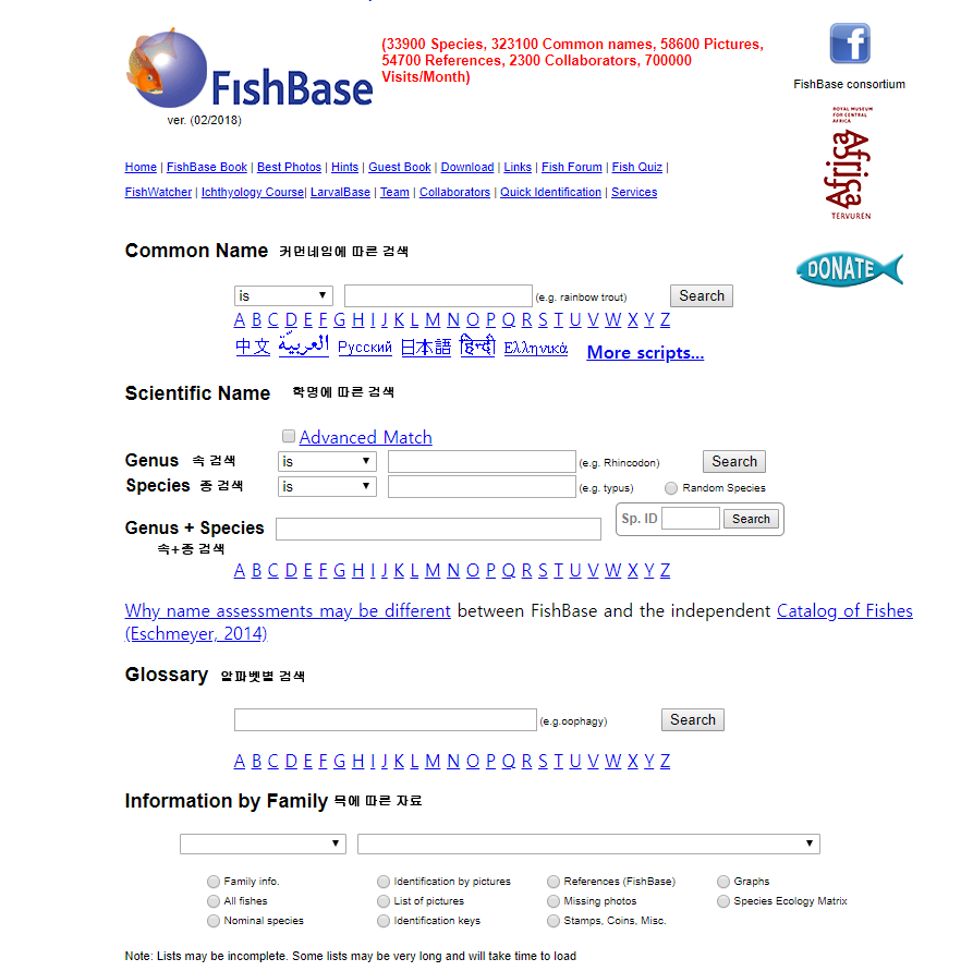 페이지 가장 상단에는 Fishbase의 로고와 얼마나 많은 종들이 등록되어있는지, 현재 방문자수는 어떤지가 나와있습니다.