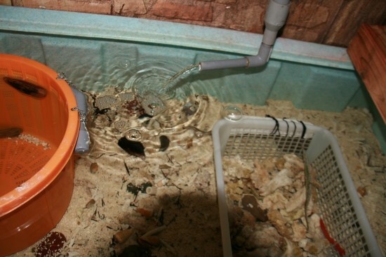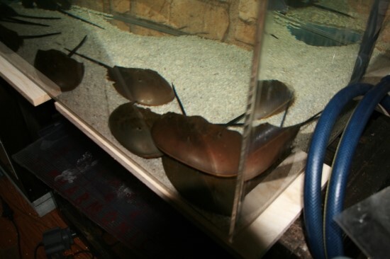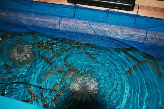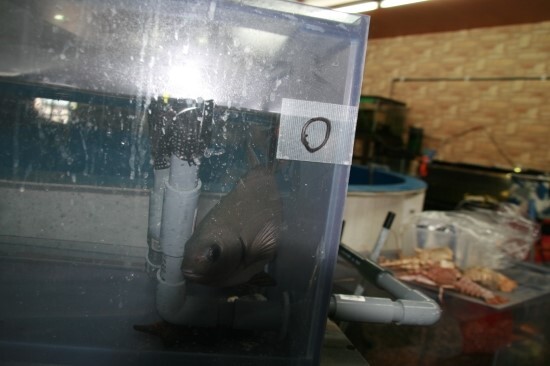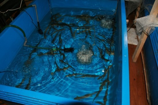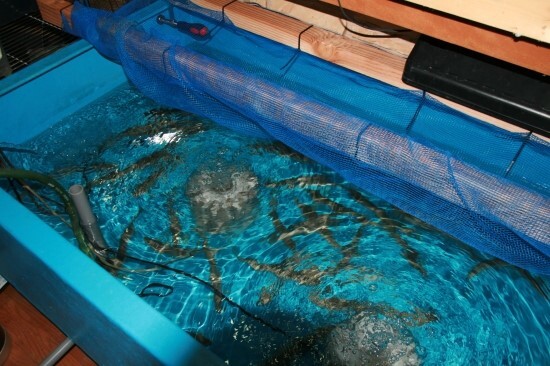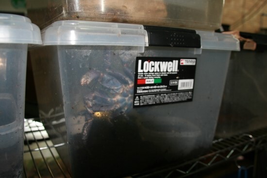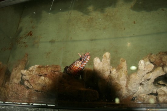 게와 해수 스네일들의 축양수조.